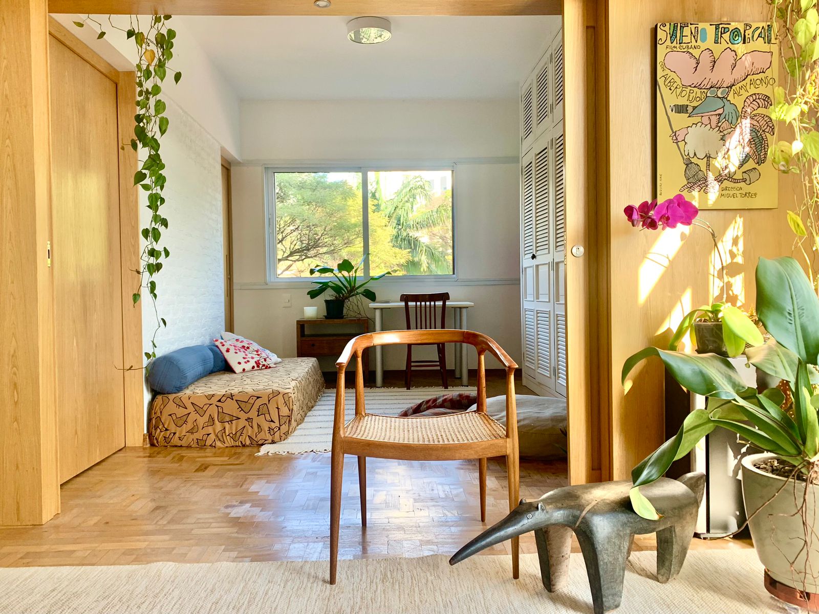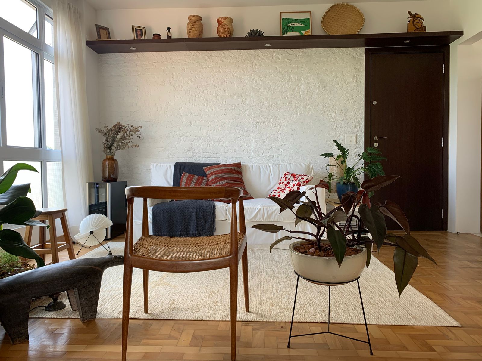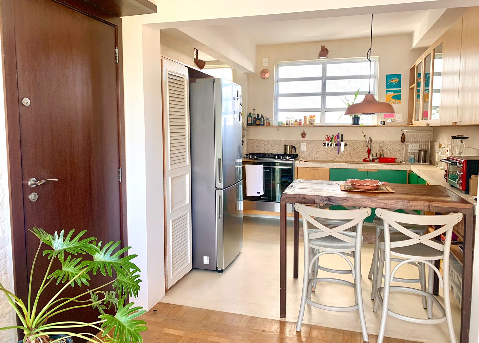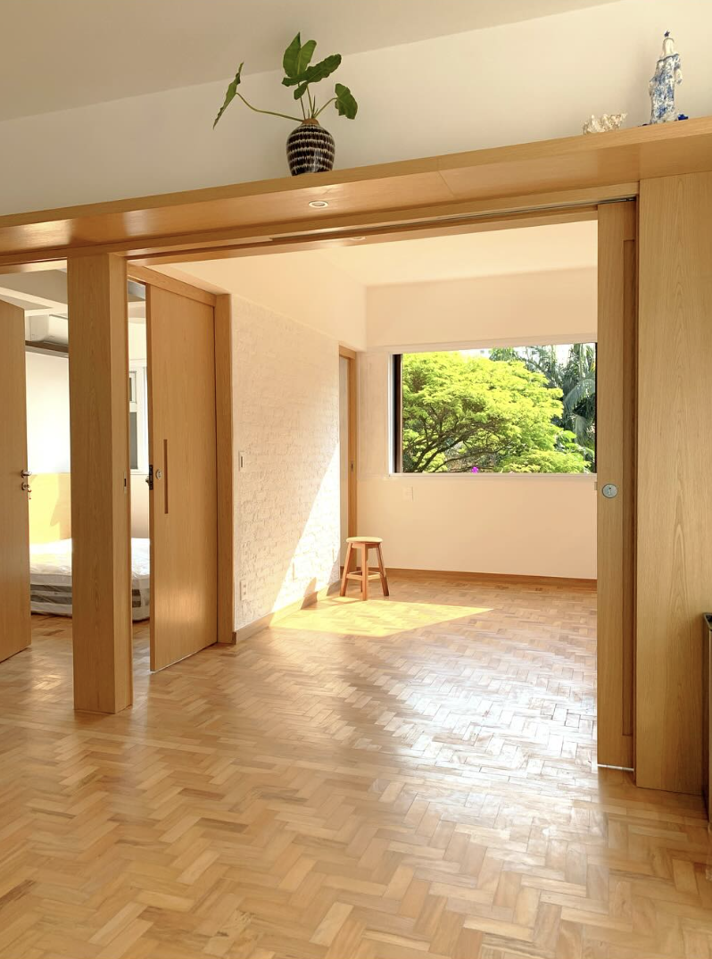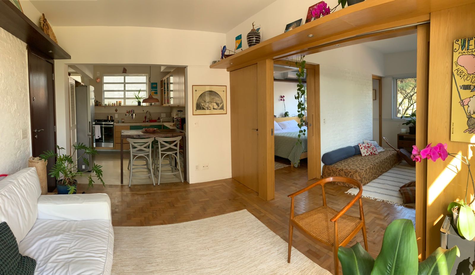 Projeto e obra completos de reforma em apartamento na Vila Madalena, criando uma planta versátil e integrada, com um ambiente solar e toque brasileiro.